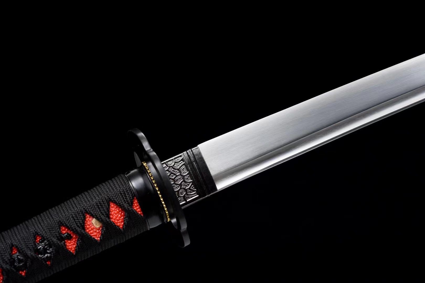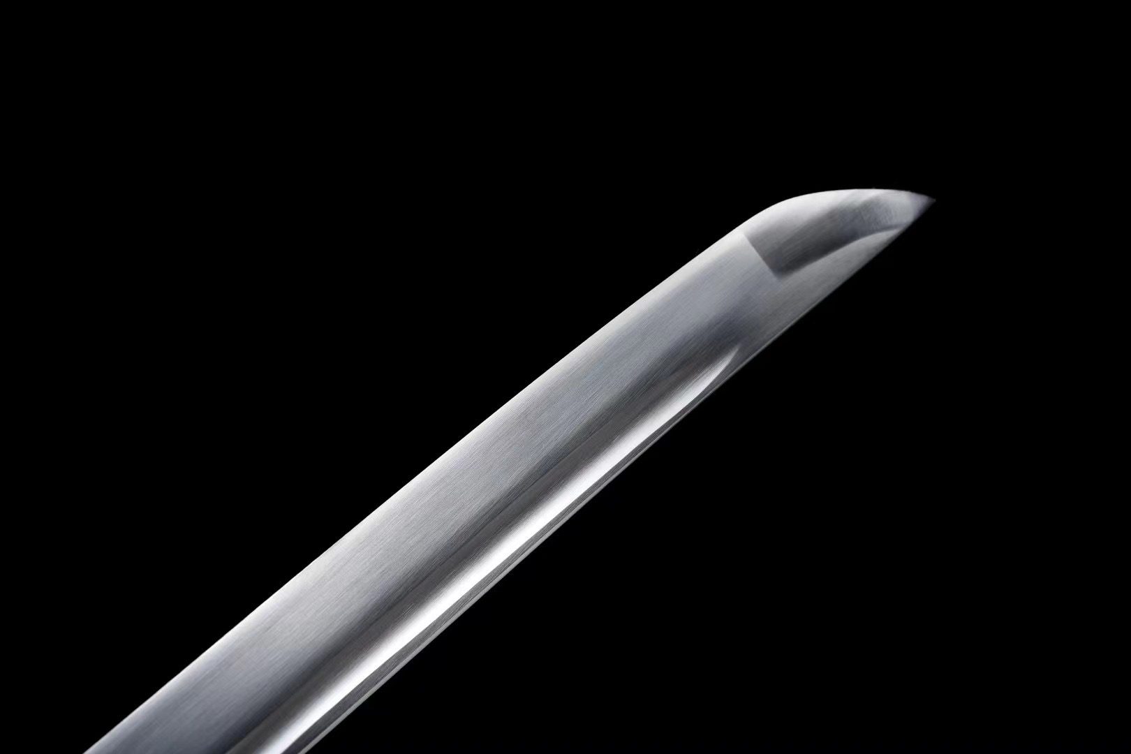 Su hoja de acero T10 de color natural presenta un acabado pulido que captura sutilmente la luz, mientras que el bo-hi tallado en su superficie aligera el efecto general y produce un característico silbido cuando se mueve. La guarda de aleación negra (tsuba) tiene una forma floral hueca en forma de cruz. La empuñadura (tsuka) combina la textura rugosa de la imitación de piel de raya roja con un trenzado negro con patrón de diamantes (tsuka-ito), lo que crea un agarre firme. Los menuki representan un dragón negro. La vaina de madera lacada en blanco (saya), salpicada de puntos negros, evoca un cielo nocturno estrellado, complementado con un sageo negro.