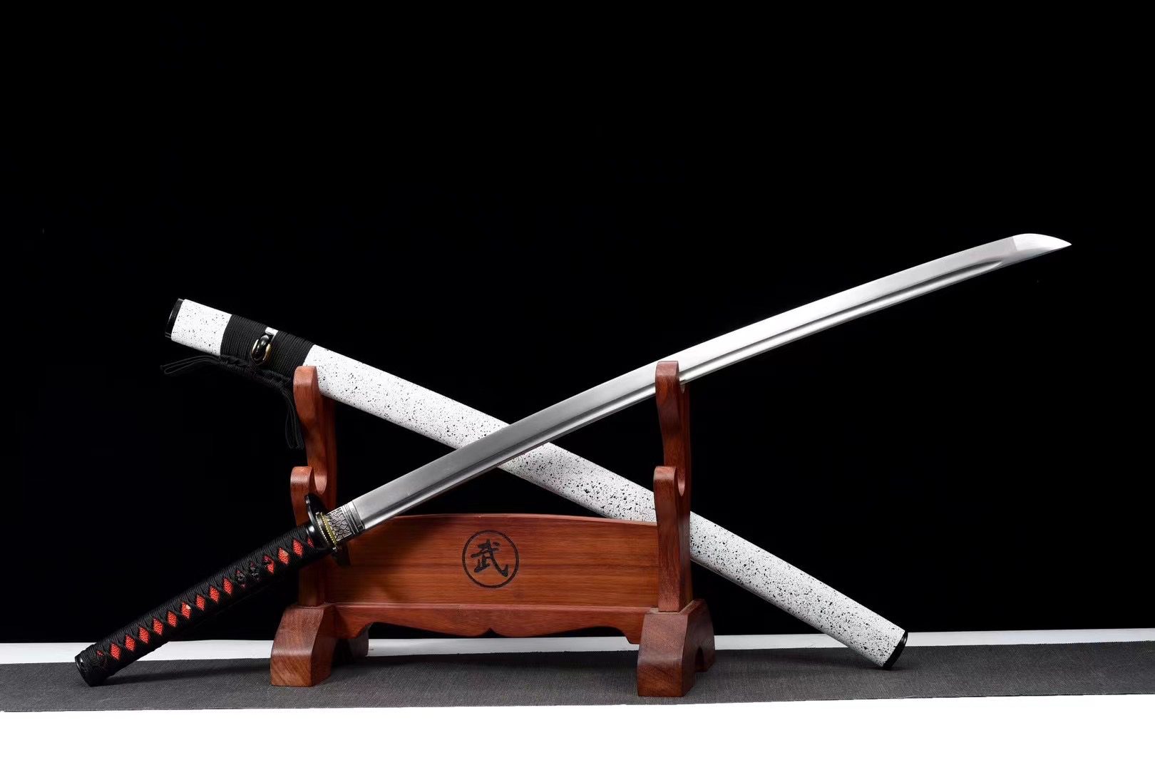 - Vaina (Saya 鞘): madera lacada en blanco decorada con puntos negros, extremos negros (Kojiri y Koiguchi).