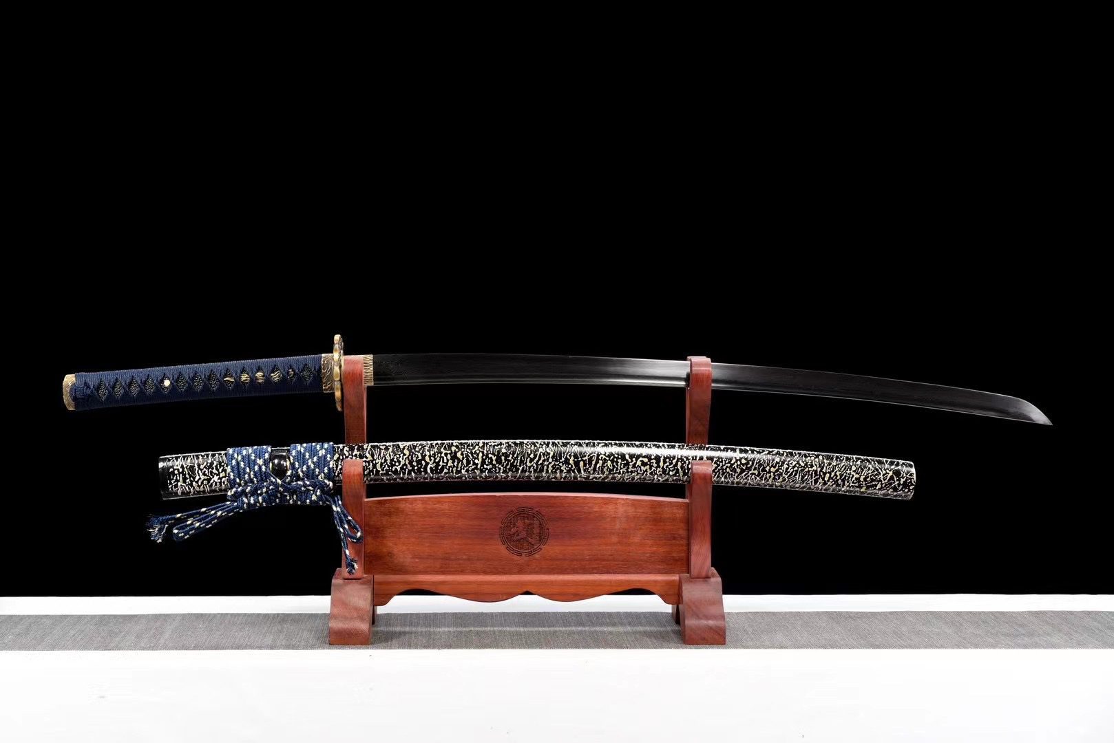 Su hoja de acero de Damasco revela sus característicos patrones ondulados que recuerdan a las llamas danzantes, mientras que el bo-hi aligera el diseño general y produce un característico silbido cuando se mueve. La guarda circular (tsuba) en aleación de oro presenta un dragón enroscado mordiéndose la cola, símbolo de la eternidad y el ciclo perpetuo, bellamente cincelado en el metal precioso. La empuñadura (tsuka) combina la tradicional imitación de piel de raya negra con un trenzado azul con motivos de rombos (tsuka-ito) que proporciona un agarre firme y elegante. Los menuki dorados representan dragones en miniatura, mientras que el fuchi y el kashira presentan motivos de llamas tallados en la aleación de oro. La vaina de madera lacada en negro (saya) está adornada con delicados motivos blancos, que contrastan con los extremos negros y se complementan con un sageo azul y blanco.