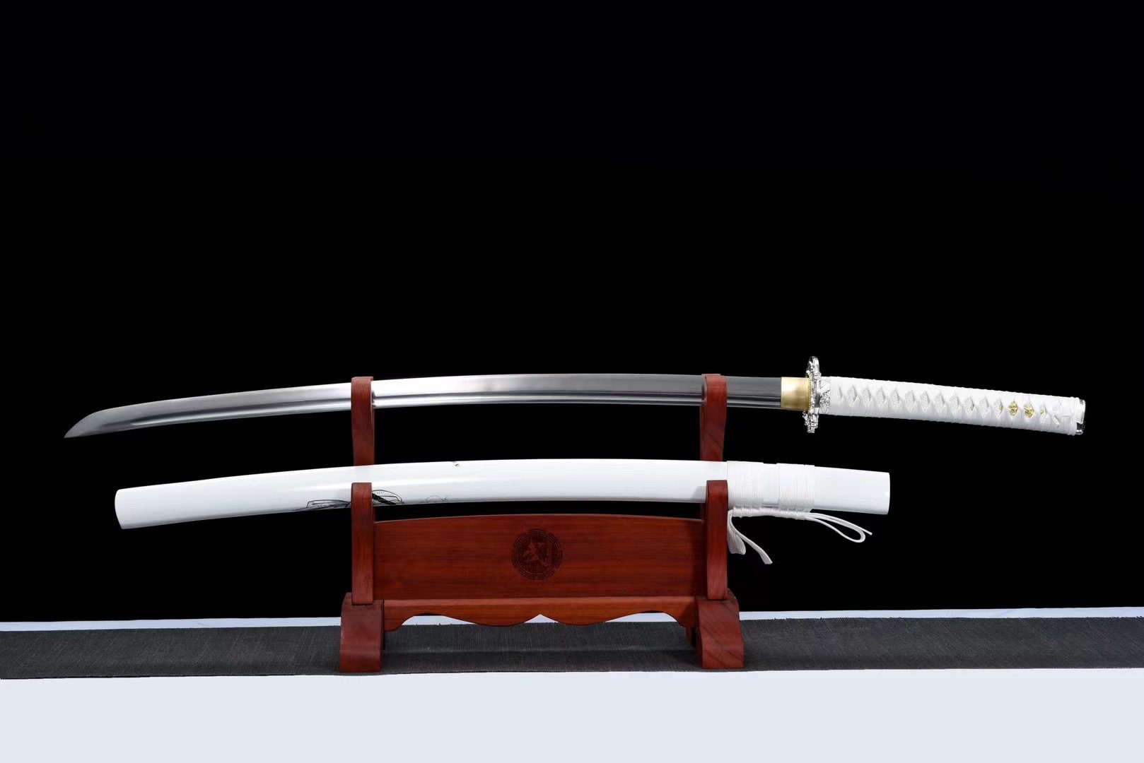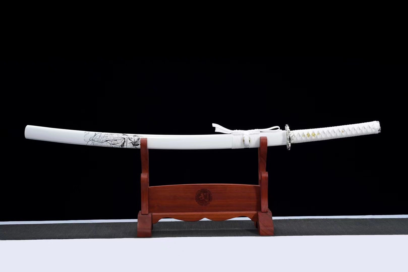 La hoja de acero T10 de color natural presenta un acabado pulido que revela los sutiles matices del metal, mientras que el bo-hi esculpe un elegante surco que aligera el diseño general y produce un característico silbido cuando se mueve. La tsuba redonda de aleación plateada presenta motivos de crisantemos finamente cincelados, símbolos de longevidad y nobleza en la tradición japonesa. El mango combina armoniosamente piel de raya samegawa blanca y madera, envuelta en un trenzado tsuka-ito blanco con motivos de diamantes que proporcionan un agarre seguro y estético. Los menuki representan un dragón dorado, el mítico guardián de la sabiduría y la fuerza, mientras que el fuchi y el kashira de aleación de plata están adornados con delicados grabados florales. La vaina lacada en blanco proporciona un lienzo excepcional para pinturas que representan a nobles mujeres japonesas con trajes tradicionales, creando un conjunto de rara sofisticación visual.
