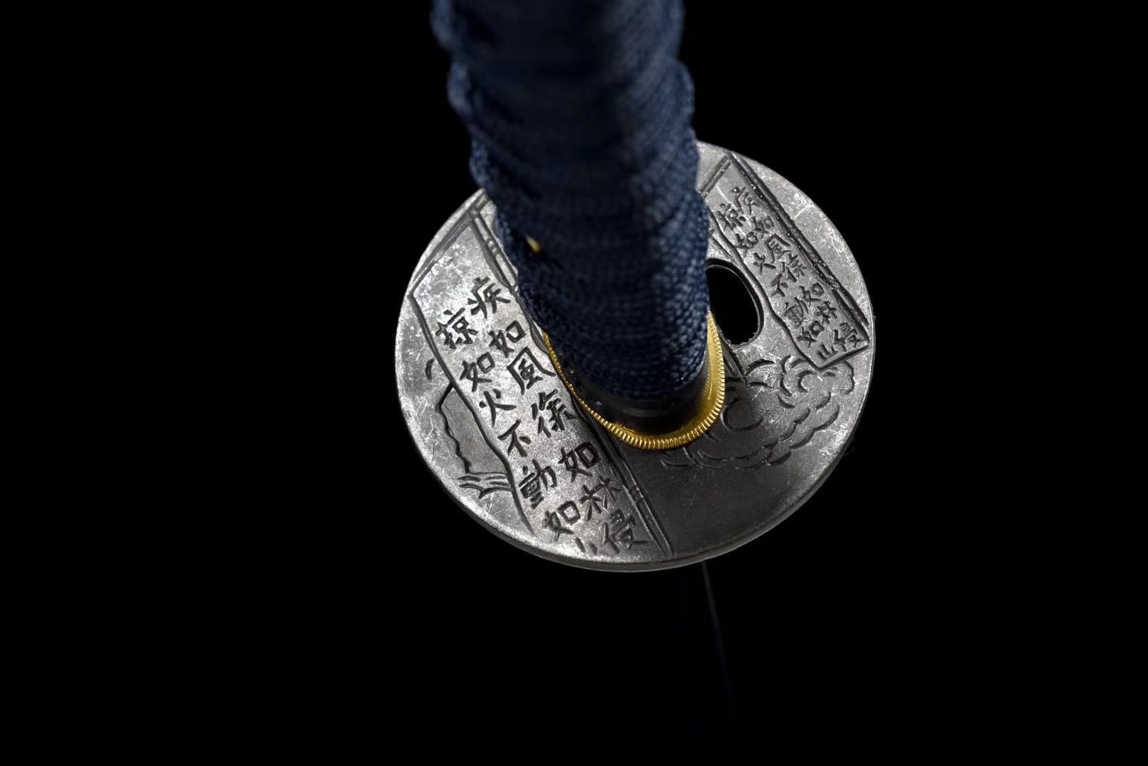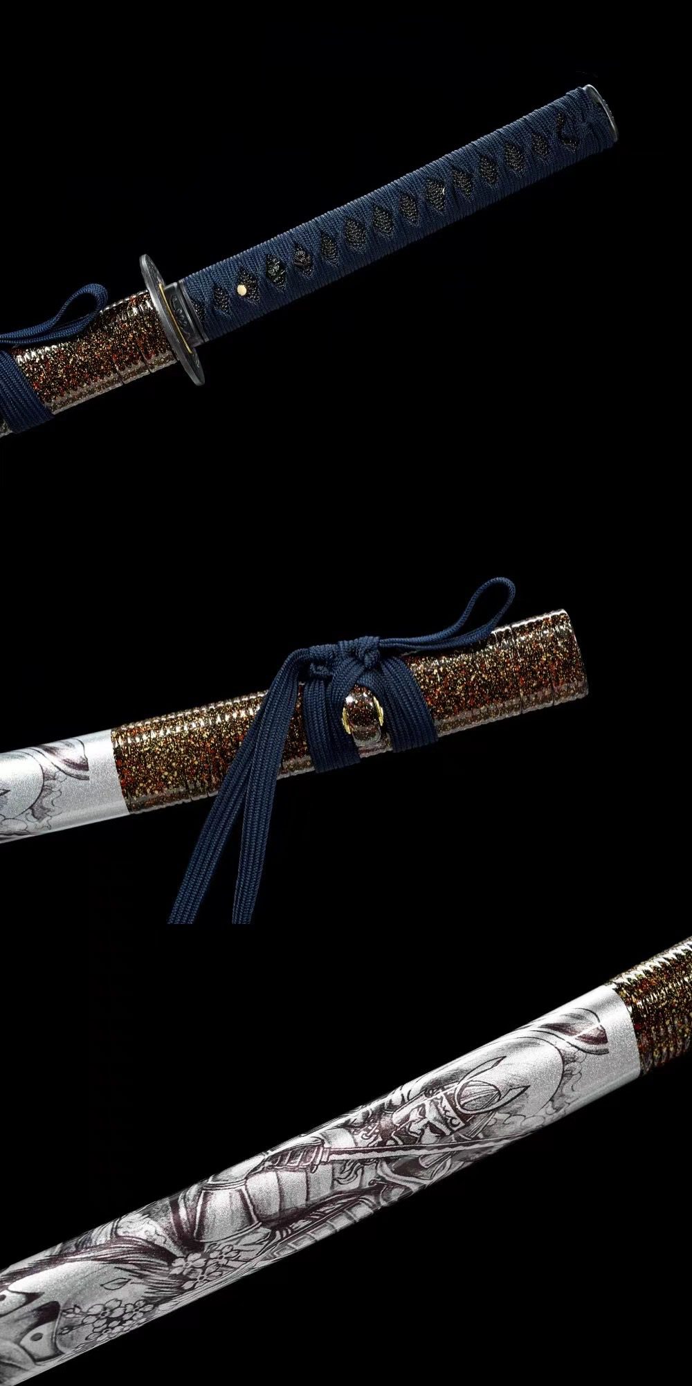 Su hoja de acero T10 revela una superficie pulida que refleja la luz con elegancia natural, mientras que el bo-hi esculpe un surco armonioso que aligera la estructura y produce una resonancia característica. La tsuba redonda de aleación negra presenta grabados detallados que representan a un samurái en acción, rodeado de símbolos tradicionales japoneses. El mango combina la textura rugosa de la piel sintética de raya negra con un trenzado azul en forma de rombos, lo que crea un agarre firme y estético. La vaina blanca granulada se distingue por su fresco samurái pintado a mano.