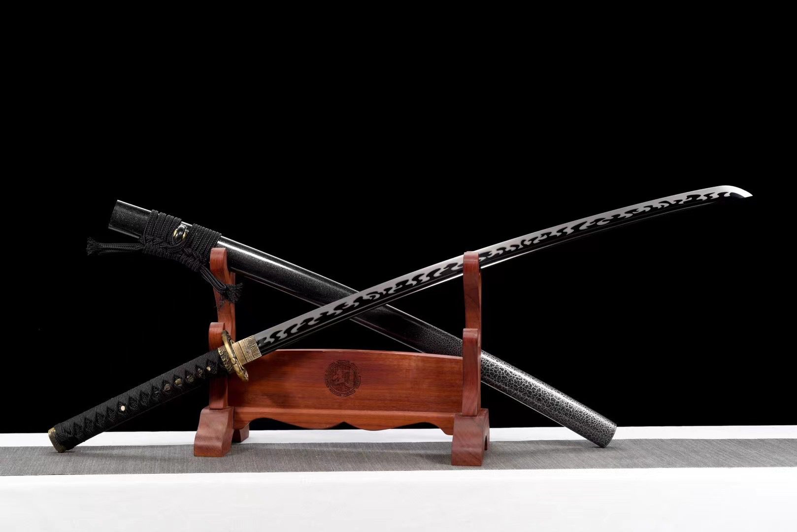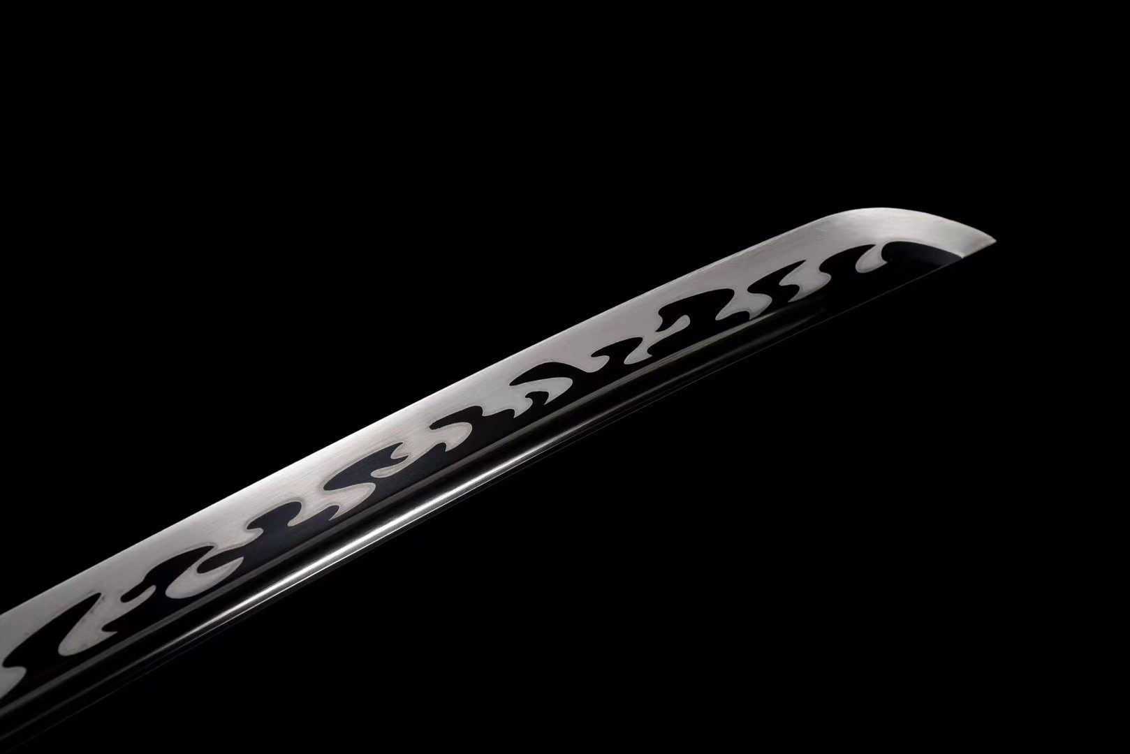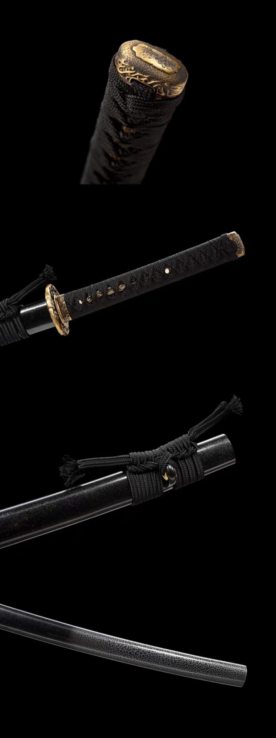 Su hoja de acero T10 presenta un llamativo acabado en dos tonos, que combina acero pulido y negro intenso, evocando las escamas del legendario dragón. El hamon Gunome Midare dibuja llamas danzantes a lo largo del filo, creando un efecto visual hipnótico que recuerda al aliento ardiente del dragón. La tsuba redonda en aleación de oro representa magistralmente un dragón envuelto en llamas, mientras que el bo-hi aligera la hoja y produce un característico silbido cuando se mueve. El mango combina imitación de piel de raya negra y madera, envuelto en tsuka-ito negro trenzado en forma de rombos que garantiza un agarre firme y elegante. Los menuki dorados presentan dragones en miniatura, y el fuchi, decorado con motivos de llamas en aleación de oro, completa armoniosamente el conjunto. La vaina de madera lacada en negro y gris granulado presenta un motivo de pantera que contrasta sutilmente con la iconografía del dragón, añadiendo una dimensión misteriosa a la obra.