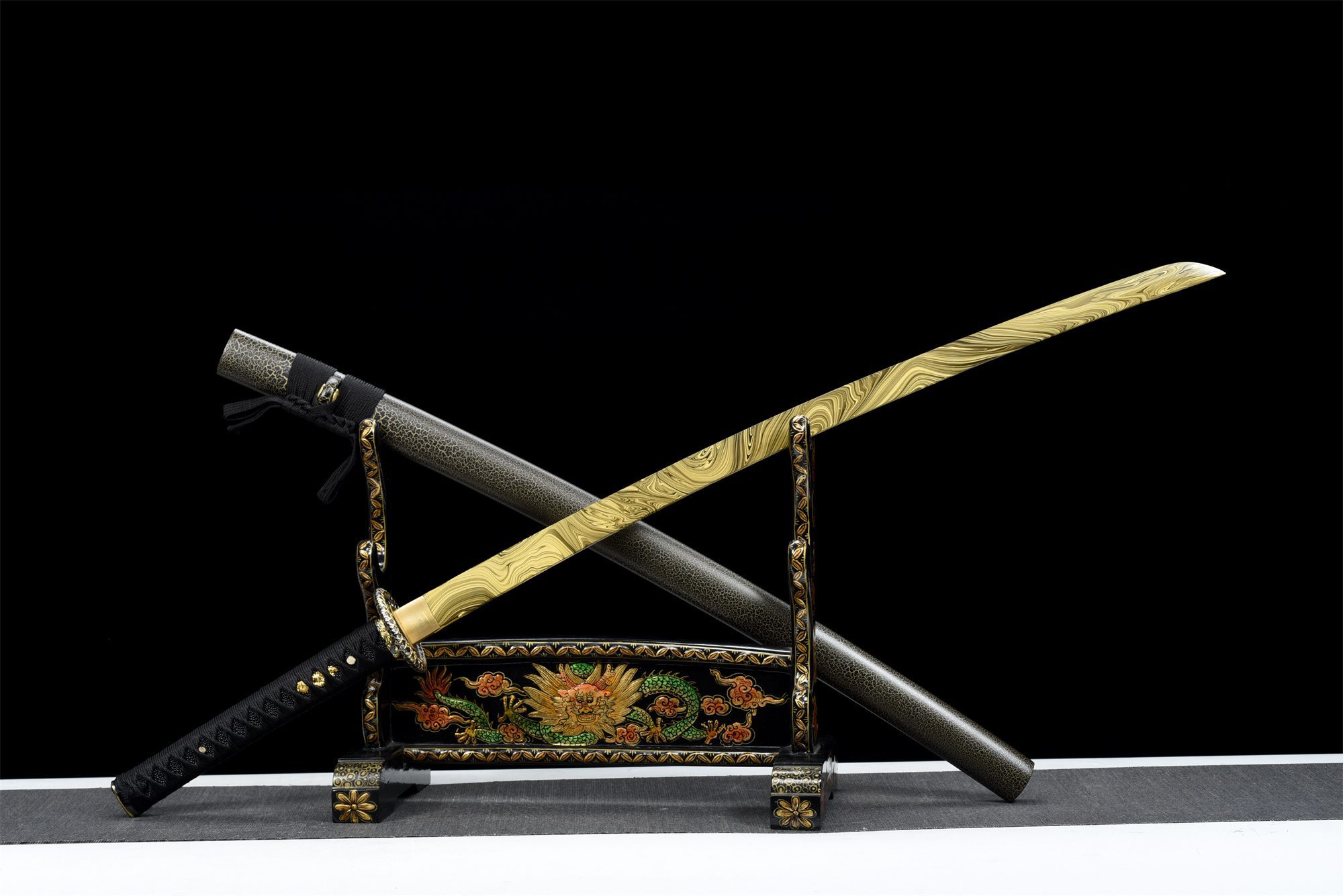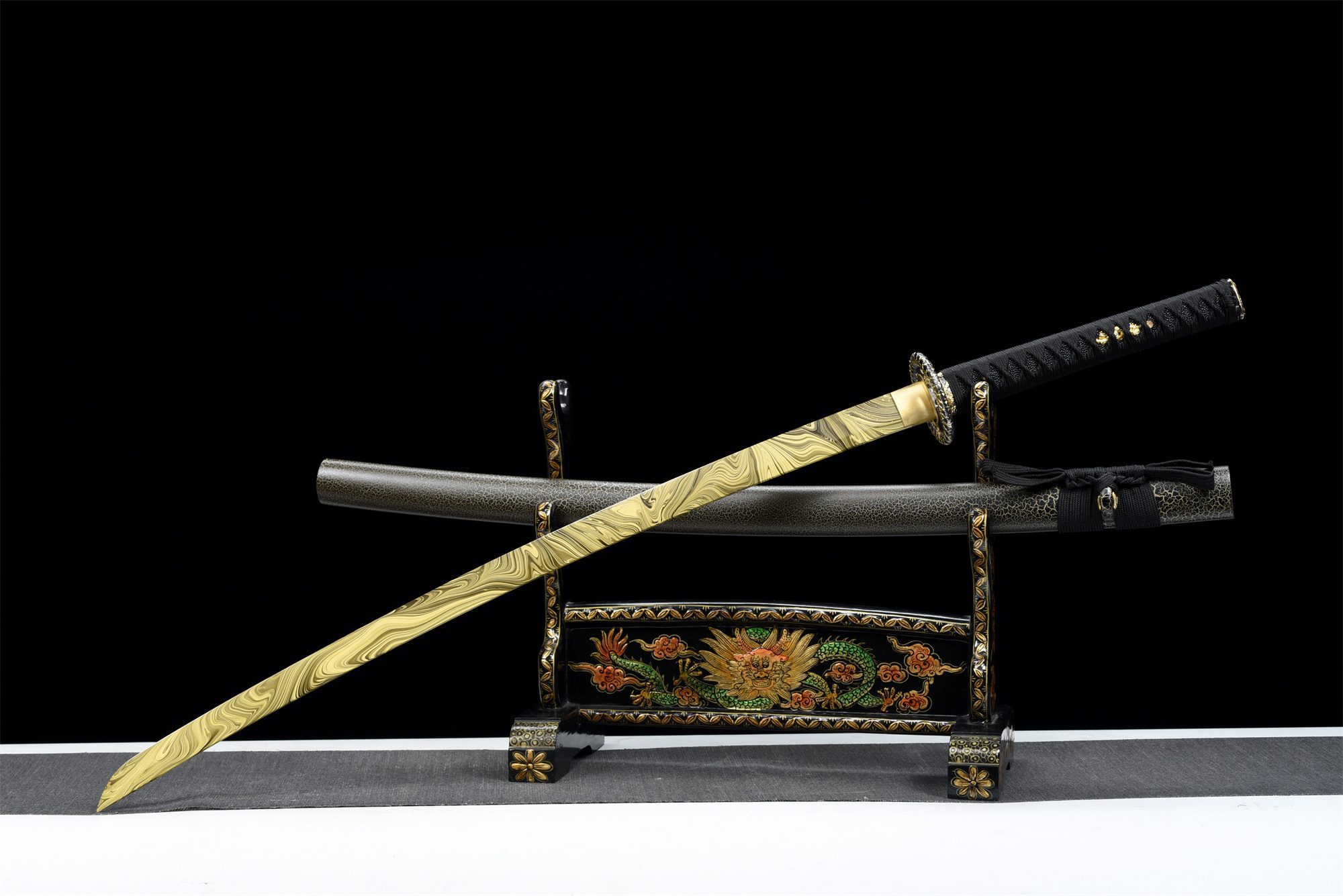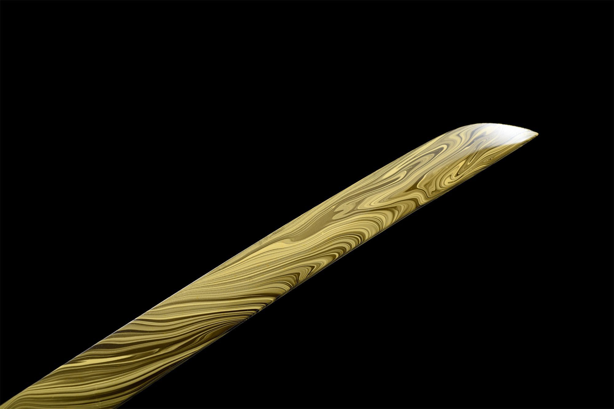 La hoja de acero al manganeso presenta un distintivo patrón amarillo que se ondula a lo largo de toda su longitud, creando reflejos dorados que bailan con la luz. Este colorido único es el resultado de un tratamiento especializado que confiere al acero sus tonos cálidos, al tiempo que preserva su resistencia. La guarda redondeada (tsuba) combina armoniosamente acentos negros profundos y dorados, creando un llamativo contraste con la aleación de cobre finamente trabajada. La empuñadura (tsuka) combina madera maciza con piel de raya negra (samegawa), entrelazada con trenzado negro (tsuka-ito) con motivos de rombos. Los menuki dorados representan un dragón, que simboliza la fuerza y la sabiduría, mientras que los fuchi y kashira dorados presentan delicados grabados florales. La vaina de madera maciza (saya) está pintada con un motivo de pantera grabada, que evoca el poder y la agilidad felinos del depredador.
