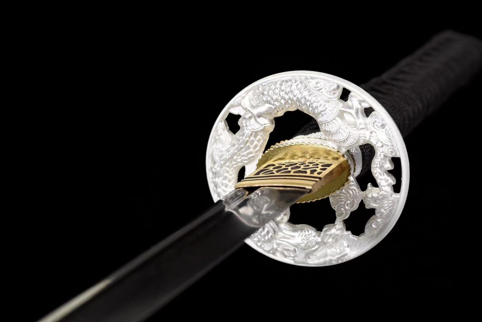 - Guarda (Tsuba 鍔): redonda, chapada en plata y decorada con un dragón grabado.