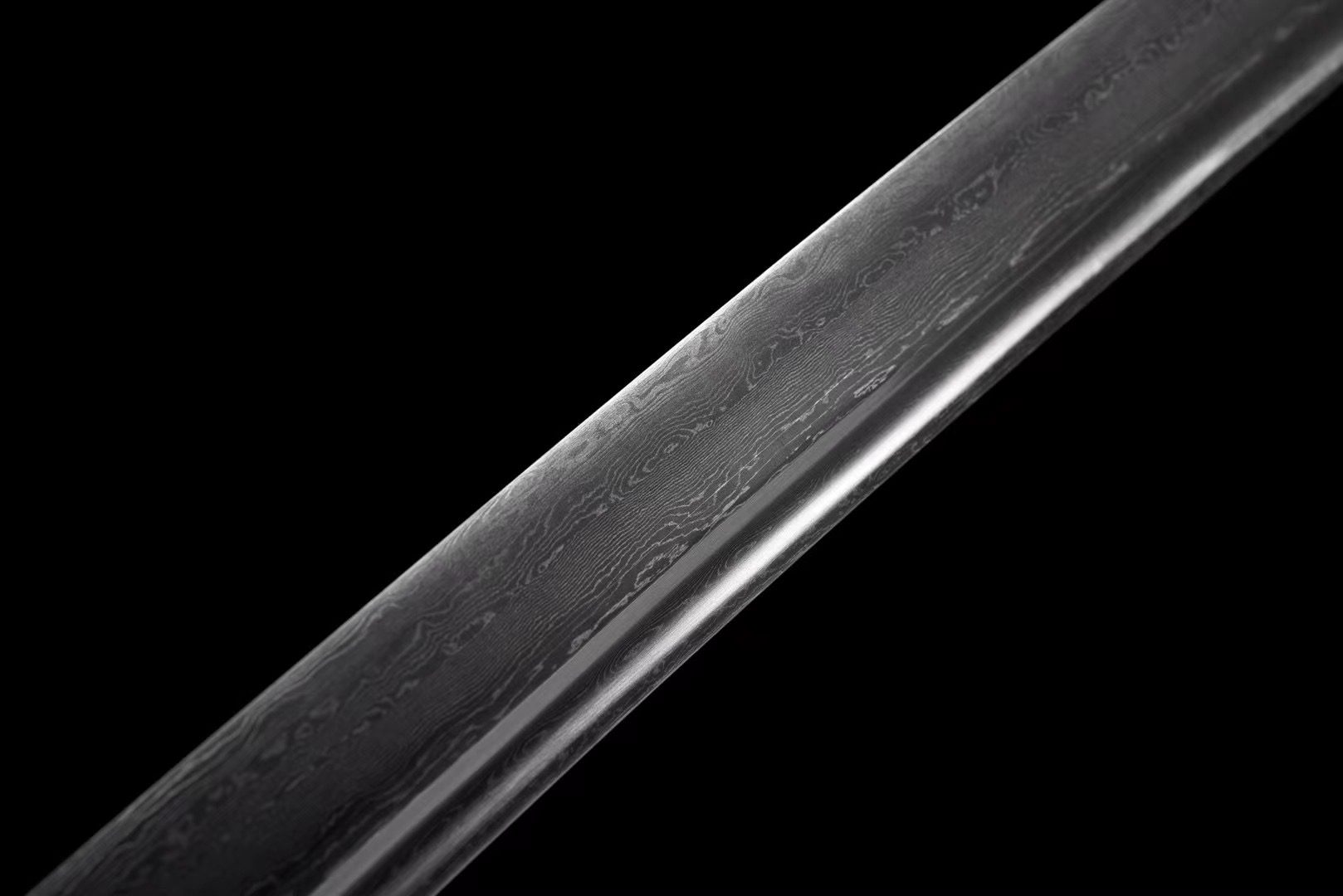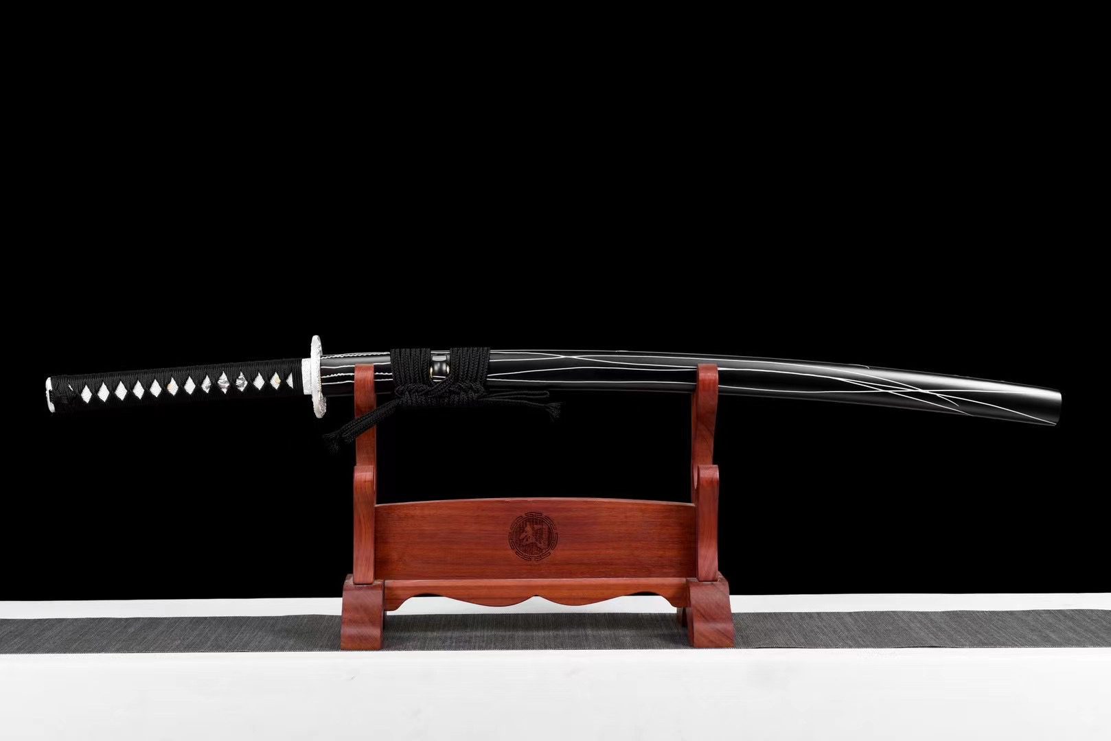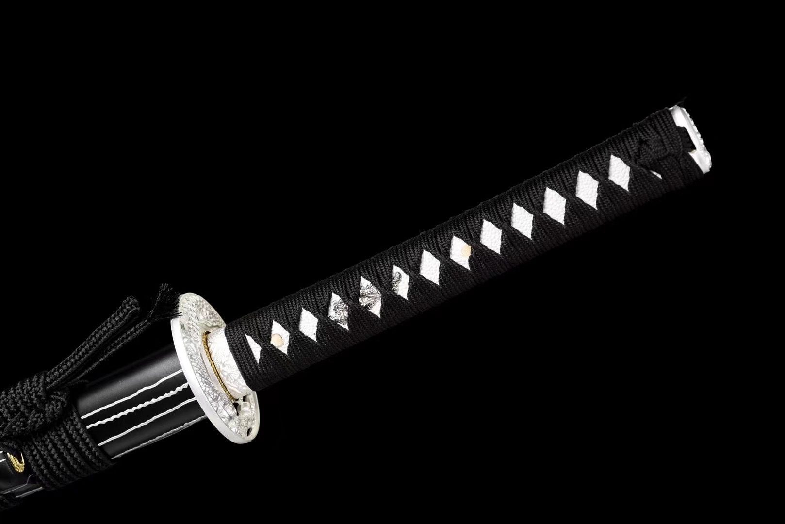 La hoja de acero damasco negro revela patrones ondulados que recuerdan a los flujos de lava congelados en la obsidiana. El bo-hi esculpe una elegante ranura que aligera la hoja y produce un característico silbido cuando se mueve. La tsuba redonda de aleación de plata contrasta maravillosamente con la hoja oscura, mientras que el dragón grabado simboliza la fuerza primordial que yace dormida en las profundidades volcánicas. El mango cuenta con auténtico samegawa blanco cubierto con un trenzado negro con patrón de diamantes, lo que crea un llamativo equilibrio visual. Los menuki representan dragones de plata que parecen emerger de las profundidades, mientras que el fuchi y el kashira, adornados con flores grabadas, añaden un toque de refinamiento. La vaina lacada en negro con rayas blancas evoca las vetas naturales de la obsidiana pulida, complementada con un sageo negro que unifica el conjunto.