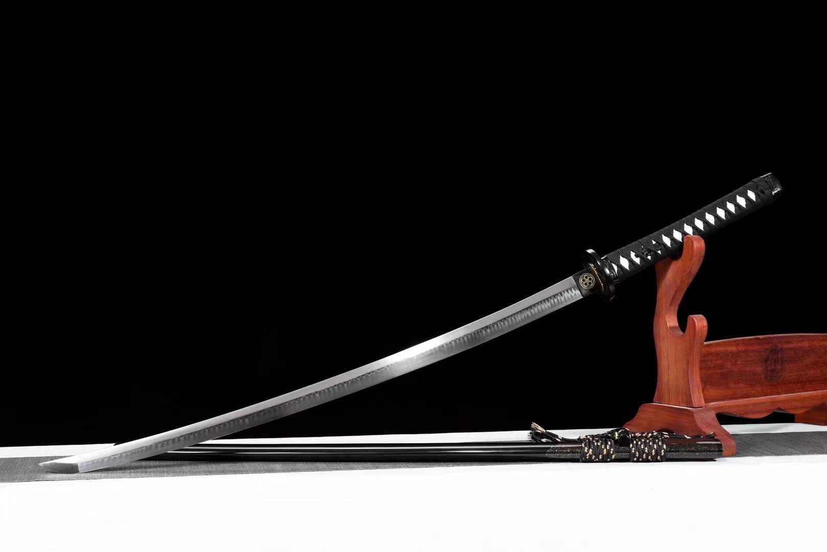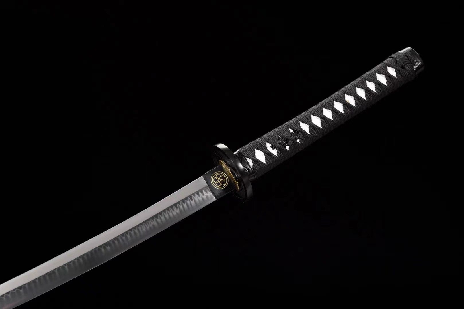 Su hoja de acero T10 revela un auténtico midare zizou hamon, resultado de un temple diferencial que crea ondas irregulares a lo largo del filo. Además, la tsuba redonda de aleación negra presenta un trípode de la vida, un motivo sagrado que también se encuentra en el fuchi y el kashira, creando una notable armonía visual. El mango combina piel sintética de raya blanca con un trenzado tsuka-ito negro en forma de rombos, mientras que los menuki representan un dragón negro, el mítico guardián de la sabiduría. Por último, la vaina de madera lacada en negro granulado está adornada con una parte superior dorada brillante, y el sageo negro y dorado completa esta refinada estética.