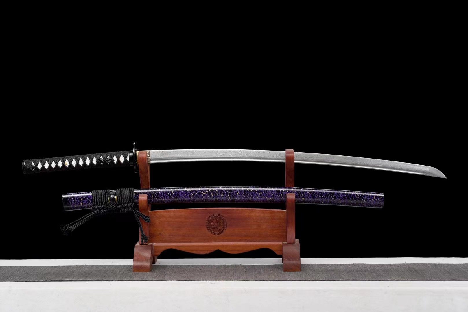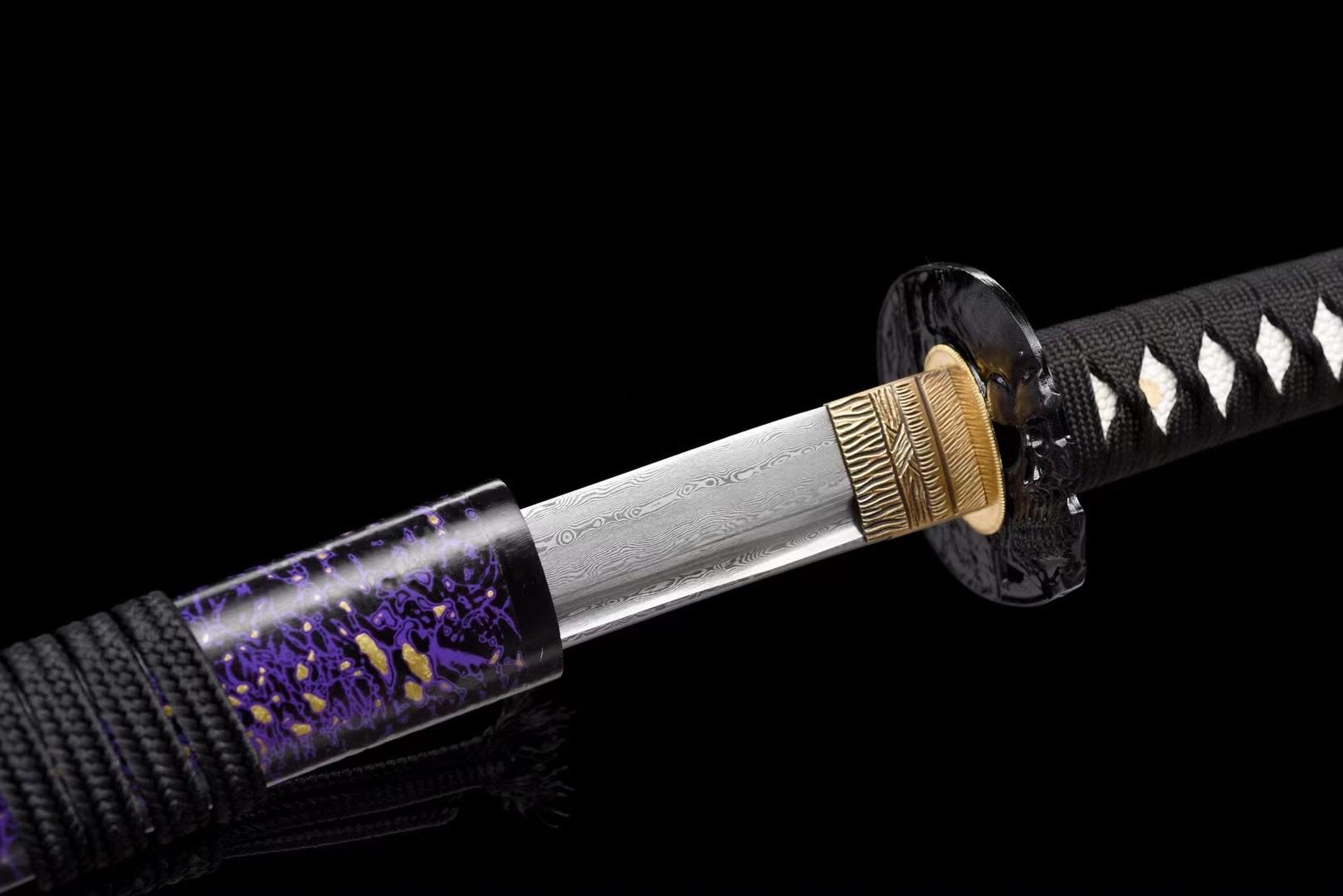 Su hoja de acero de Damasco revela patrones ondulados que recuerdan al humo que se eleva en un campo de batalla, mientras que el bo-hi aligera la estructura y produce un característico silbido cuando se mueve. La guarda (tsuba) de aleación negra con forma de calavera es el elemento central de esta katana, un recordatorio constante de la fragilidad de la existencia. La empuñadura (tsuka) combina piel de raya blanca con madera, creando un llamativo contraste con el trenzado negro con patrón de diamantes (tsuka-ito). Los menuki que representan un dragón negro simbolizan la fuerza espiritual que trasciende la muerte, mientras que los elementos fuchi y kashira de aleación negra lisa prolongan la estética oscura. La vaina (saya) de madera lacada en morado y negro evoca los colores del luto y la nobleza, complementada con un sageo negro y extremos negros que unifican el conjunto.
