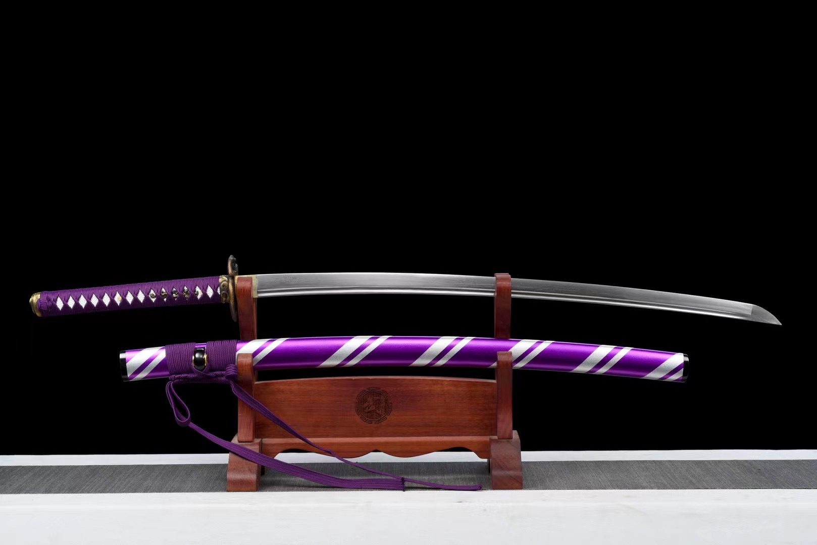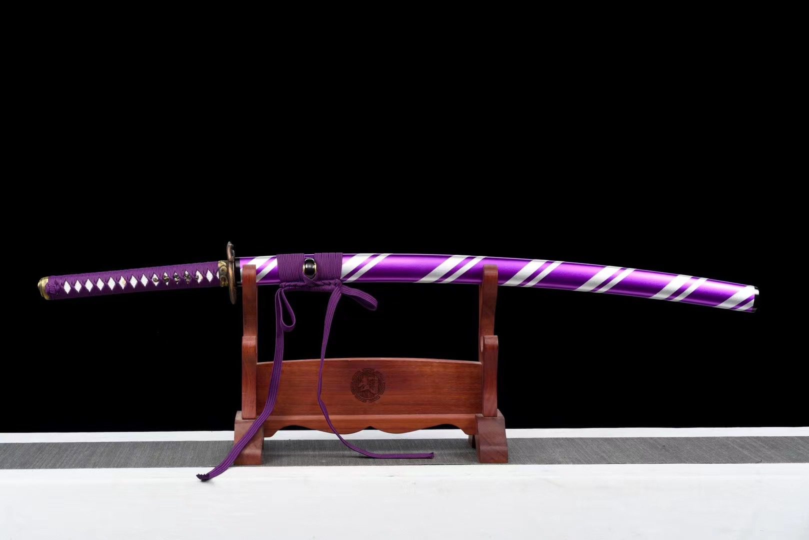 - Vaina (Saya 鞘): madera lacada con líneas alternas blancas y moradas, con Kojiri y Koiguchi negros.
