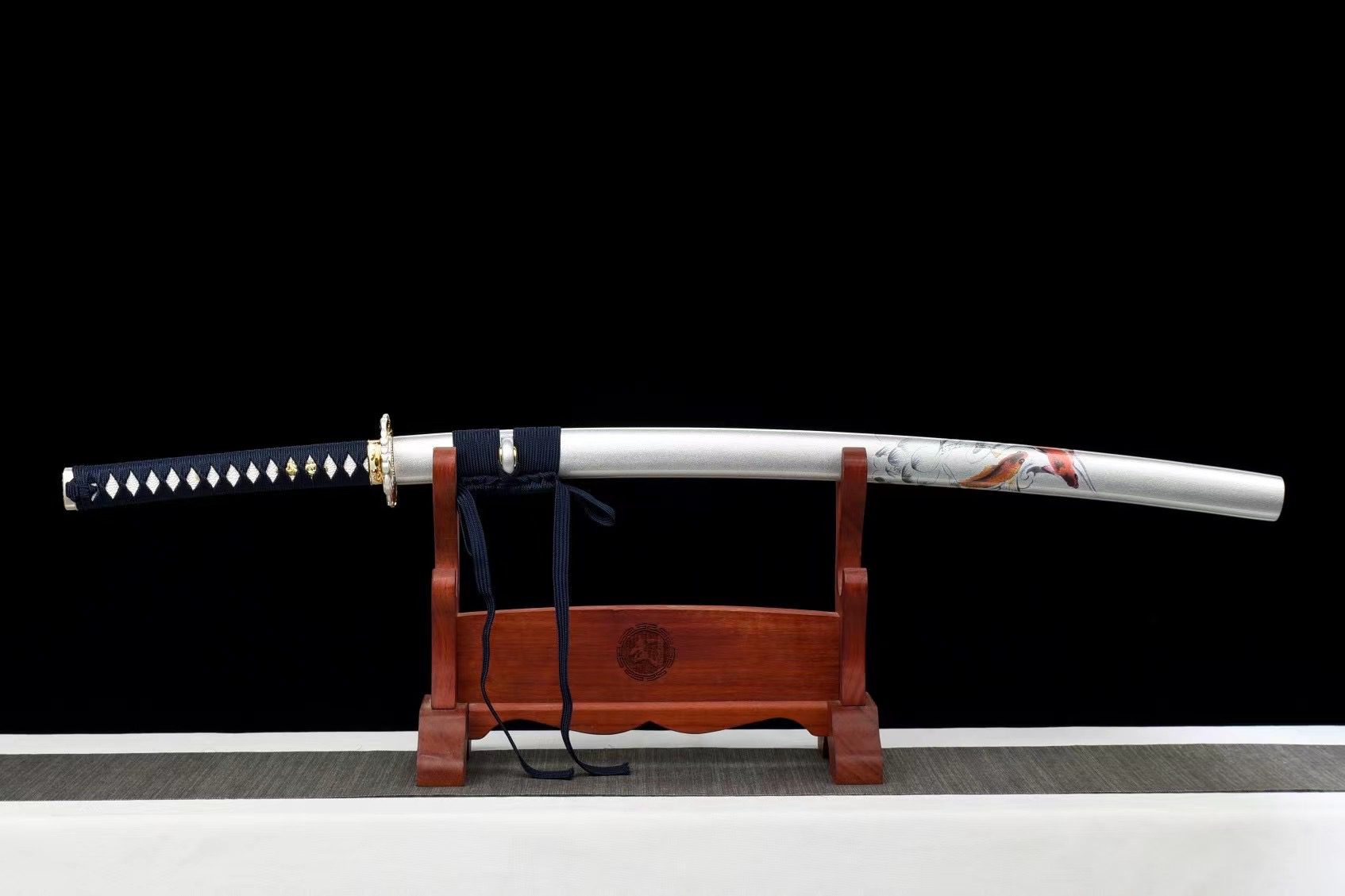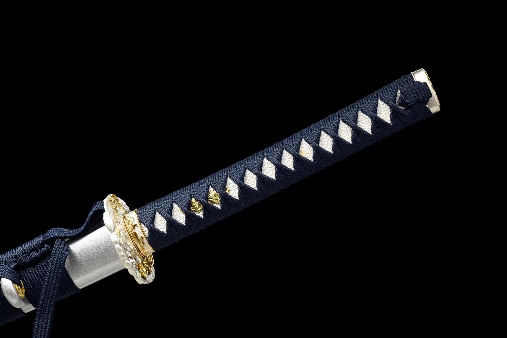 Su hoja de acero T10 presenta un tono azul intenso que recuerda los reflejos de un arroyo a la luz de la mañana. Este colorido único combina a la perfección con la tsuba redonda de aleación de plata y oro, adornada con símbolos de peces que nadan en un eterno ballet acuático. La empuñadura combina la textura rugosa de la piel sintética de raya blanca con la calidez de la madera, mientras que el trenzado azul con patrón de rombos crea un refinado efecto geométrico. Los menuki representan un dragón dorado, mítico guardián de las aguas celestiales, y el habaki de latón cepillado lleva un kamon tradicional. La vaina de madera lacada en blanco granulado presenta un delicado fresco de peces de colores, creando un llamativo contraste con el sageo azul que completa esta sinfonía cromática.