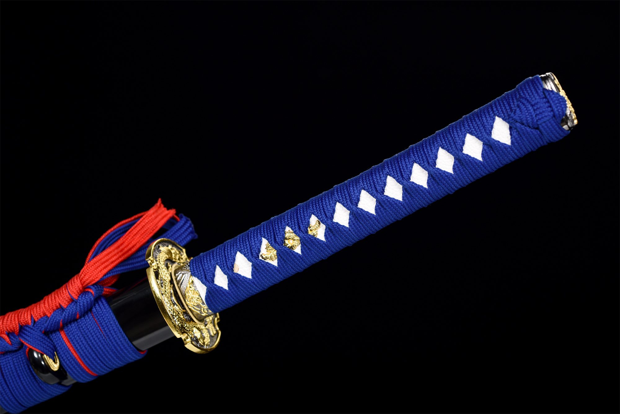 - Tsuka-ITO (柄糸): Azul trenzado por encima de la empuñadura, con diseño de rombos.