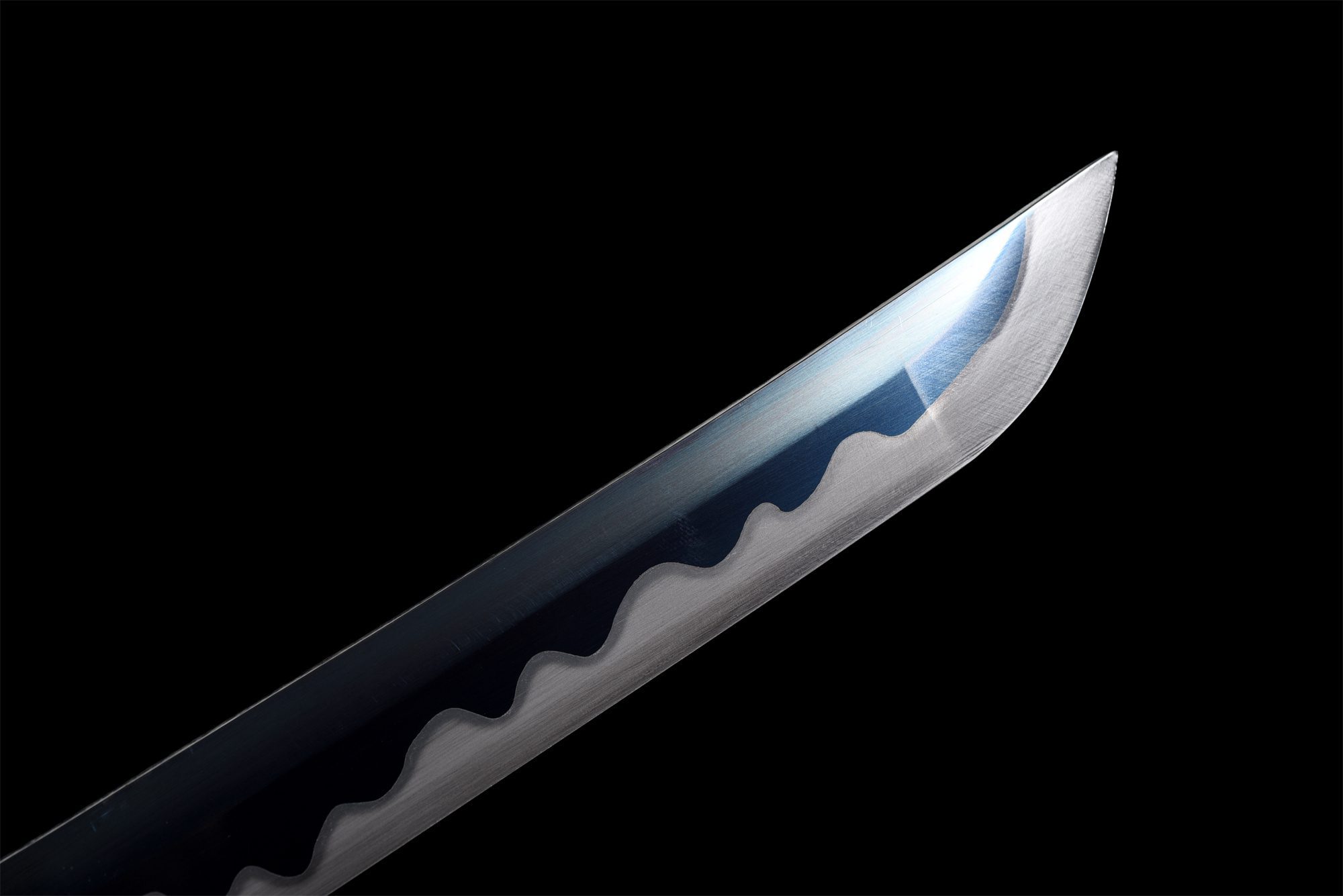 Su hoja de acero al manganeso tiene un tono azul único que recuerda a las escamas del legendario dragón, mientras que el patrón midare notare hamon forma ondas irregulares que recuerdan a las nubes donde reside Seiryū. La tsuba redondeada de cobre presenta un motivo en forma de cruz adornado con un dragón dorado, lo que crea un llamativo contraste con la hoja oscura. La empuñadura está recubierta de piel de raya blanca sintética para un agarre firme, con un trenzado azul (tsuka-ito) que forma rombos regulares. Los menuki dorados representan fielmente al dragón celestial, mientras que los fuchi y kashira de cobre revelan delicados motivos florales que complementan la refinada estética. La vaina de madera lacada en negro está adornada con un majestuoso dragón dorado, acompañado de un sageo bicolor azul y rojo que recuerda los colores del cielo al amanecer.