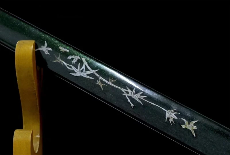 - Saya (鞘): vaina de madera lacada en verde con símbolo floral pintado en blanco.