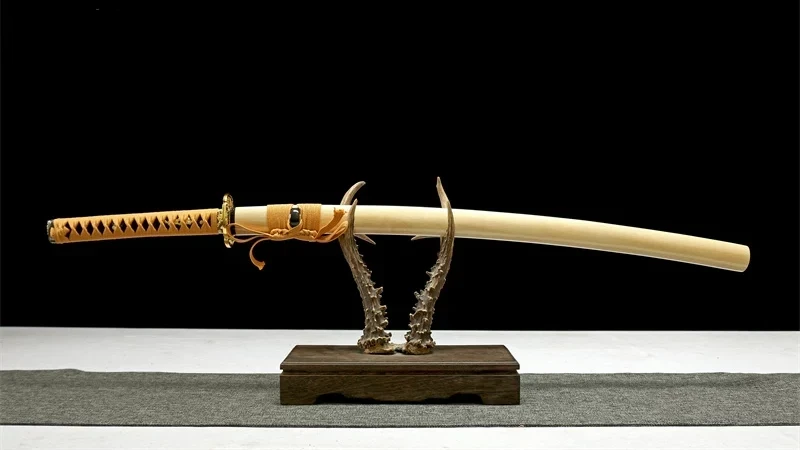 La espada katana Sabaku no Ha presenta una hoja de acero T10 de espiga completa, disponible afilada o no afilada, con un brillante tono plateado que le confiere una resistencia y durabilidad inigualables. La empuñadura es de piel de raya negra de imitación y está bellamente envuelta con un tsuka-ito naranja arena tejido en forma de rombos, que recuerda los cálidos colores del desierto. La guarda cruciforme redondeada, de color negro y dorado, está adornada con un dragón dorado enroscado, que confiere al arma un aspecto majestuoso. La vaina es de madera en bruto de color claro y presenta un sageo de color naranja arena, que evoca las dunas y el árido paisaje. Los detalles incluyen un menuki de dragón dorado, un fuchi de flor dorada, una kashira de aleación de plata y un habaki de latón liso. Cada elemento de la Sabaku no Ha evoca la descarnada belleza de la extensión desértica, de ahí su nombre de hoja del desierto, Sabaku no ha (砂漠の刃) en japonés.