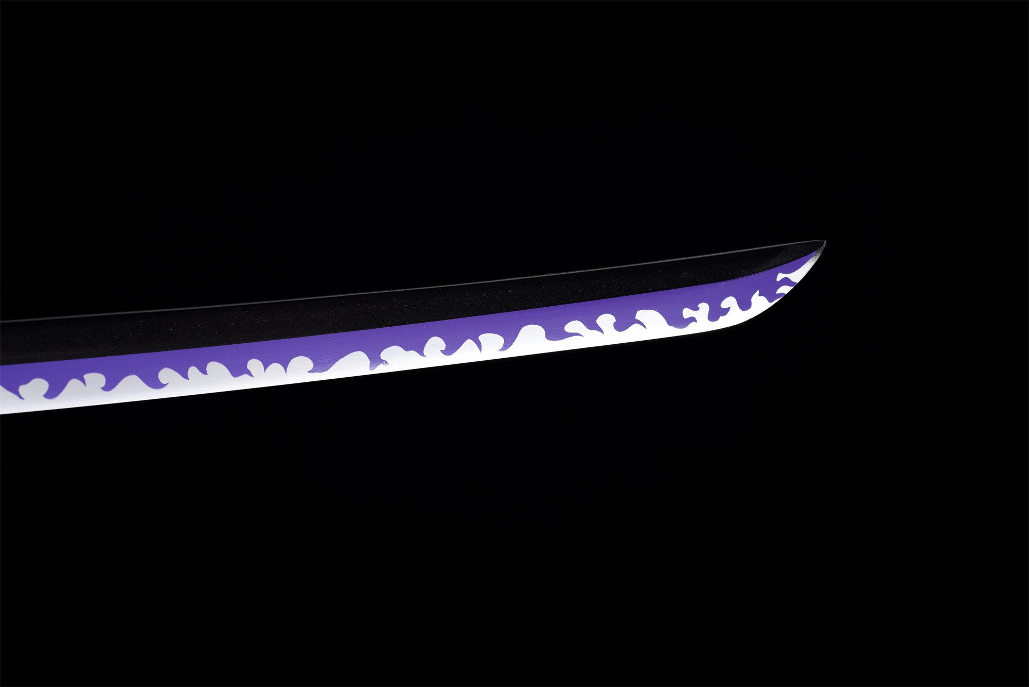 La hoja de acero T10 revela un espectacular acabado con tonos negros, grises y morados que evocan los misterios del inframundo de Enma. Esta coloración única captura sutilmente la luz, mientras que la guarda en forma de flor de tres pétalos simboliza la belleza mortal de esta formidable espada. La empuñadura de madera maciza ofrece un agarre sólido, envuelta en un trenzado negro y rojo que contrasta armonosamente con el menuki floral dorado. La vaina de madera dura está adornada con laca negra profunda, realzada por cordones rojos que recuerdan los lazos del destino, mientras que los anillos kojiri y koiguchi dorados añaden un toque de refinada elegancia.