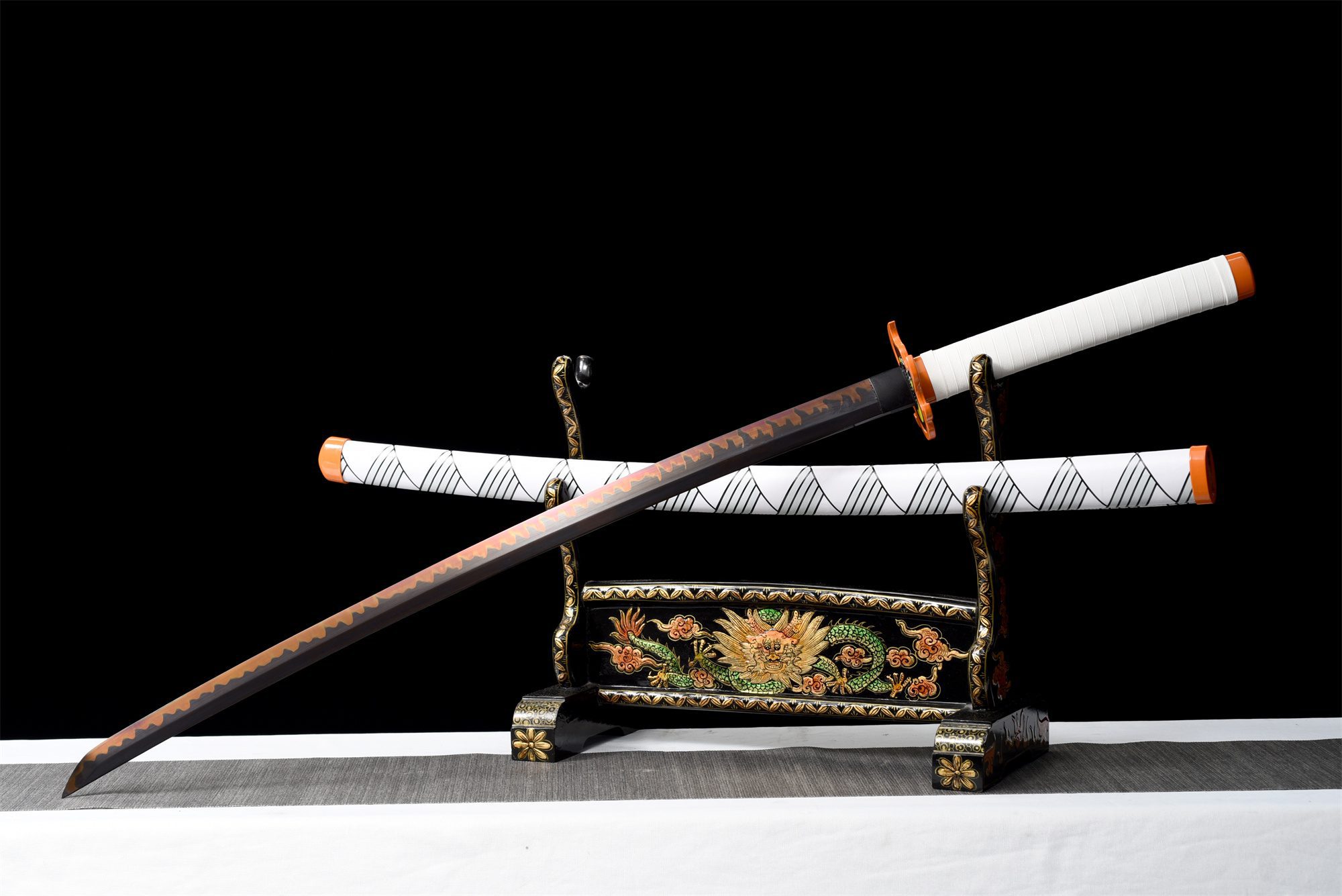 Su hoja de acero T10 presenta un acabado negro y naranja que recuerda las llamas características del estilo de lucha de Rengoku. El auténtico midare hamon en forma de llama, conseguido mediante un templado diferencial, ondula a lo largo del filo como un fuego eterno. La tsuba en forma de llama presenta un núcleo amarillo brillante rodeado por un borde naranja, reproduciendo fielmente la estética de la katana de Rengoku. La empuñadura combina piel de raya sintética y madera, envuelta en un trenzado de cuero blanco que proporciona un agarre firme y cómodo. El fuchi y el kashira naranjas completan armoniosamente el conjunto, mientras que el habaki negro crea un llamativo contraste. La vaina de madera lacada en blanco y decorada con motivos negro-verdes evoca el característico uniforme de los cazadores de demonios, con sus extremos naranjas que recuerdan a las llamas eternas.