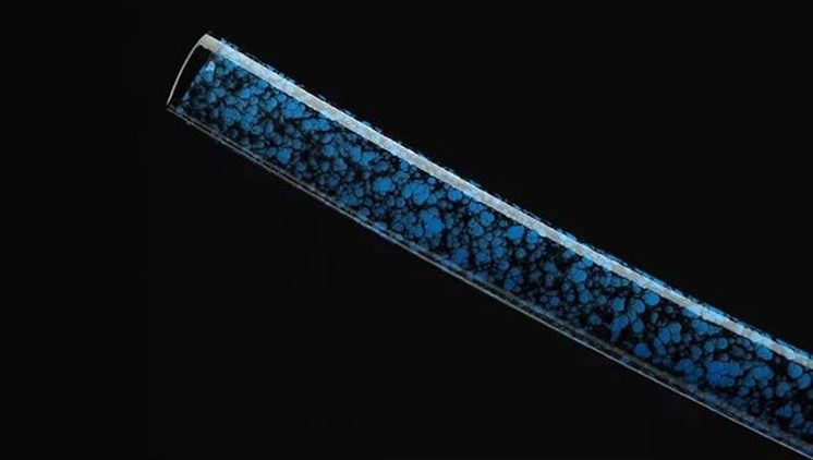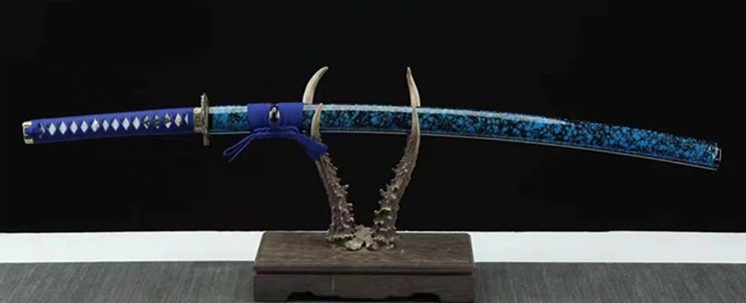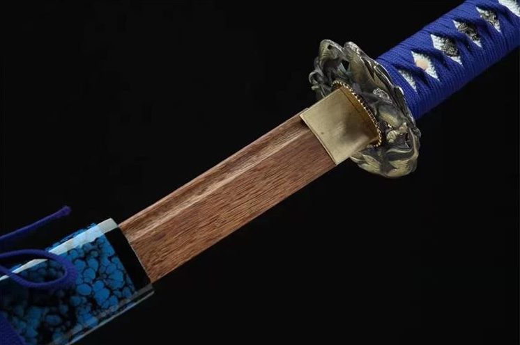- Saya (鞘): vaina de madera negra y azul moteada.