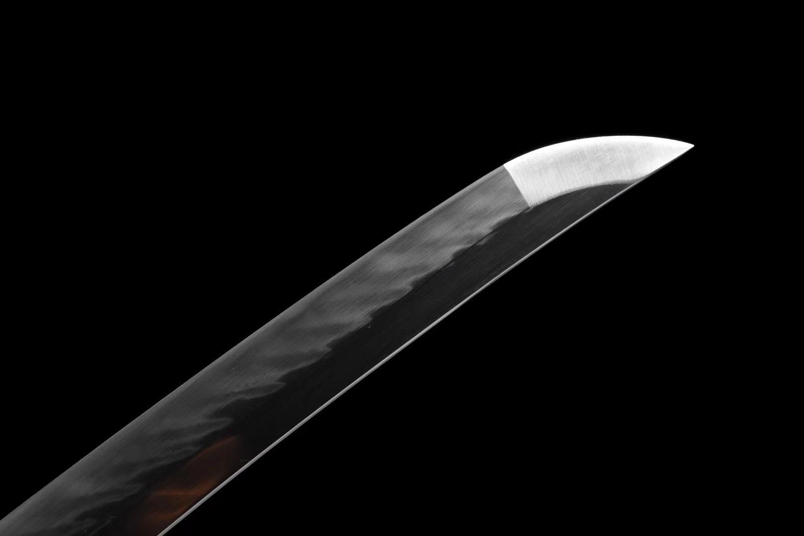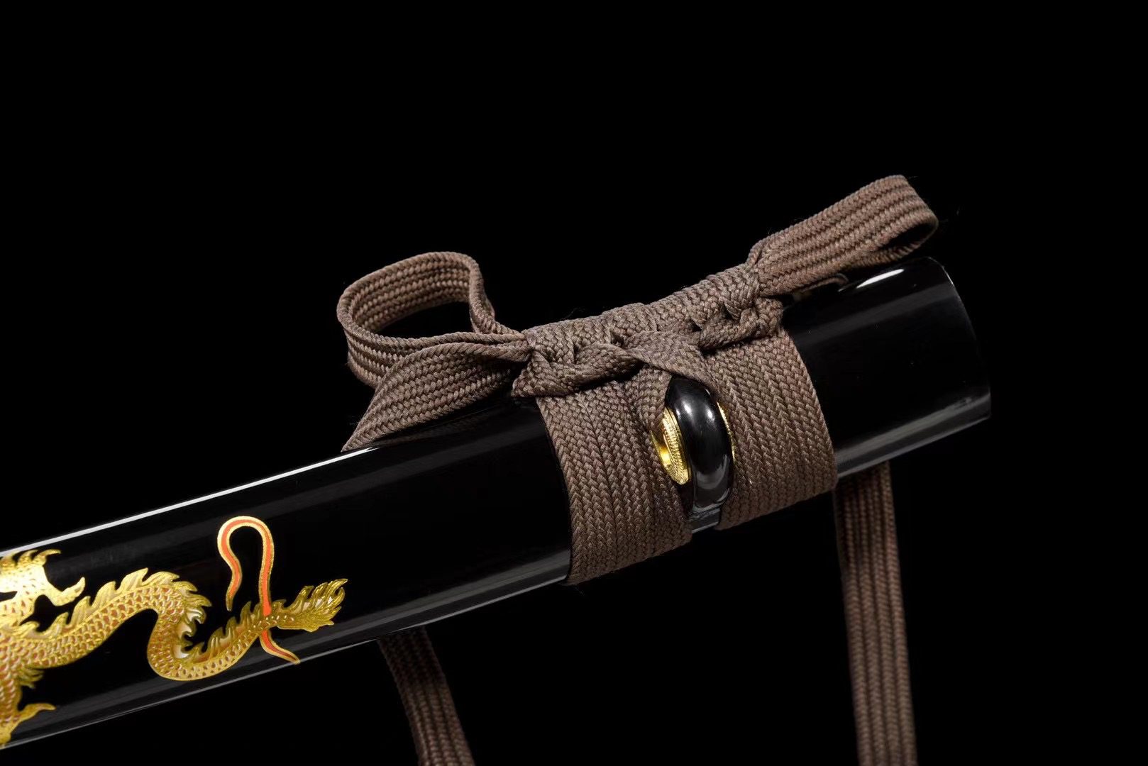 La hoja de acero T10 revela un auténtico notare hamon, resultado del templado diferencial tradicional que crea ondulaciones naturales a lo largo del filo. Esta antigua técnica confiere a la hoja una resistencia excepcional, al tiempo que preserva su flexibilidad. La tsuba representa un dragón enroscado en aleación de hierro negro, cuyas curvas fluidas complementan a la perfección la estética oscura del conjunto. El mango combina armoniosamente madera y piel sintética de raya negra, mientras que el trenzado marrón con patrón de rombos (tsuka-ito) añade un toque contrastante de calidez. Los menuki presentan dragones negros en miniatura que parecen vigilar la mano de quien lo lleva. La vaina lacada en negro está adornada con un dragón dorado pintado, una criatura celestial que se eleva majestuosamente desde la superficie oscura, simbolizando el equilibrio entre la sombra y la luz.