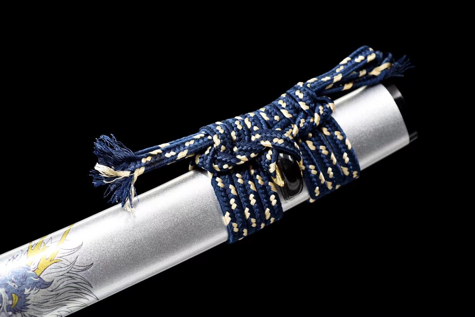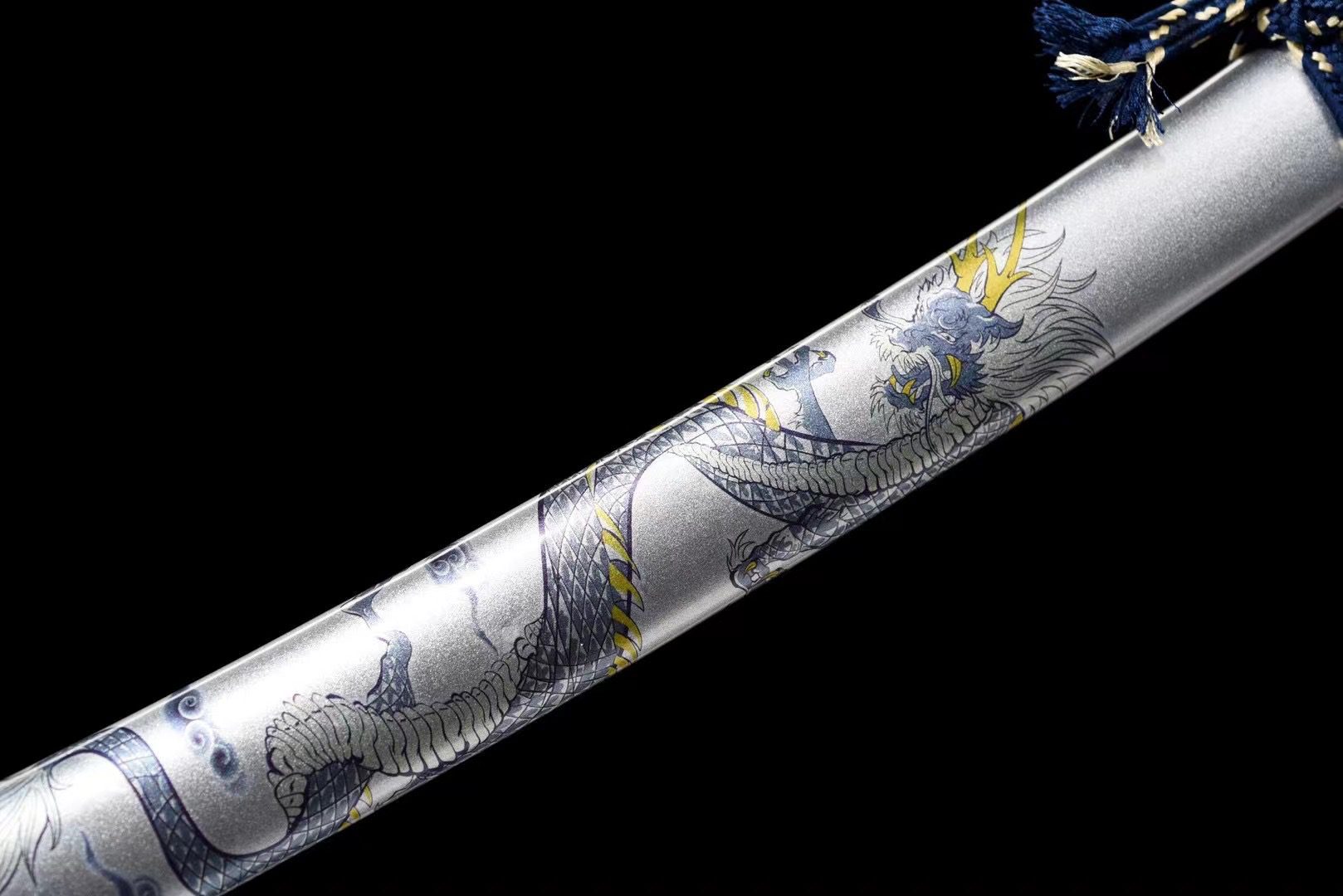 La hoja de acero T10 revela un auténtico gunome hamon, resultado de un templado diferencial que crea ondas irregulares a lo largo del filo. El bo-hi tallado en el acero aligera la hoja y produce un característico silbido cuando se mueve. La tsuba redonda presenta un llamativo contraste entre el blanco y el negro, realzado por un delicado dorado que evoca el equilibrio de las fuerzas opuestas. La empuñadura, cubierta de samegawa blanco y trenzada con un impecable tsuka-ito en forma de rombos, presenta menuki que representan dragones dorados. El fuchi y el kashira de aleación blanca adornados con flores doradas completan esta armonía cromática, mientras que la vaina lacada en gris está decorada con un dragón azul y amarillo que parece cobrar vida en su superficie pulida.
