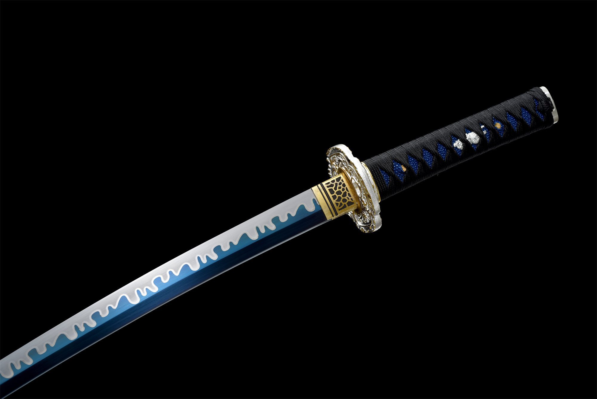 - Empuñadura (Tsuka 柄): mango de madera maciza con piel sintética de raya azul.